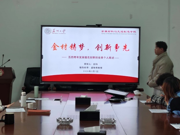 为弘扬五四精神、践行新时代青年使命,金属材料与先进制造欧美激情于2026年3月1日,在冶金楼4004会议室召开苏州大学五四青年奖——欧美激情提名奖评选会。欧美激情党委副书记徐海洋,辅导员郁佳莉、邹力子出席活动,会议由成苗主持,其中成苗、郁佳莉和邹力子与各学生组织负责人担任本次活动评委。