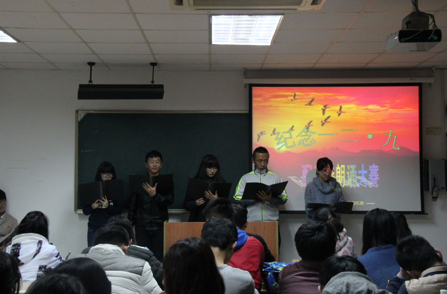 2015年12月9日晚6:30,欧美激情 纪念“一二·九运动”配乐诗朗诵大赛在工科楼205教室举行。担任此次活动评委的有辅导员郁佳莉老师,团委副主任吴贵菁、学生会主席郝月莹、科协理事长王心怡以及社联副主席施嘉伦。
