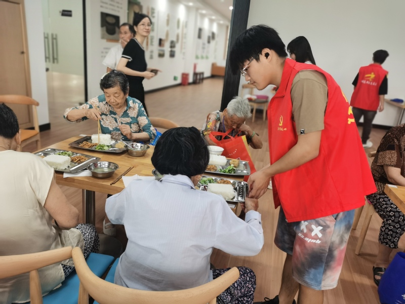 工作人员的带领下,队员们来到社区居家养老日间照料中心,为老人们分发午餐。他们多已是耄耋之年,老伴西去,与儿女生活在一起;白天儿女工作,老人孤身在家无伴。社区就组织了这个日间照料中心,为老人们提供一个集体游玩活动的场所,也解去儿女的担忧。十点半,爷爷奶奶们结伴坐在餐厅,闲聊着地等待饭菜,还有的自备小酒解解馋。小队的任务是将每个人的饭菜端到桌子上,然后陪他们聊聊天。尽管在他们的身上可以明显地感受到岁月摧残的痕迹,但他们却像孩童般,用纯善的真心对待他人,以笑脸迎接来人的“打扰”。老吾老以及人之老,实践队员用自己的行动传扬中华民族的传统美德。